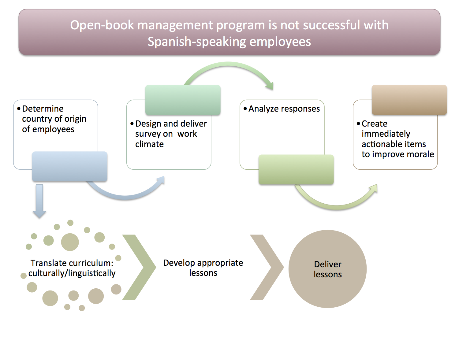 The main issue other than the language barrier that was preventing full engagement with the new management system was a lack of trust between Spanish-speaking employees and management. I used my Spanish skills to earn employees' trust and communicate their positive feedback, concerns, and career goals to management. The project included the following phases: